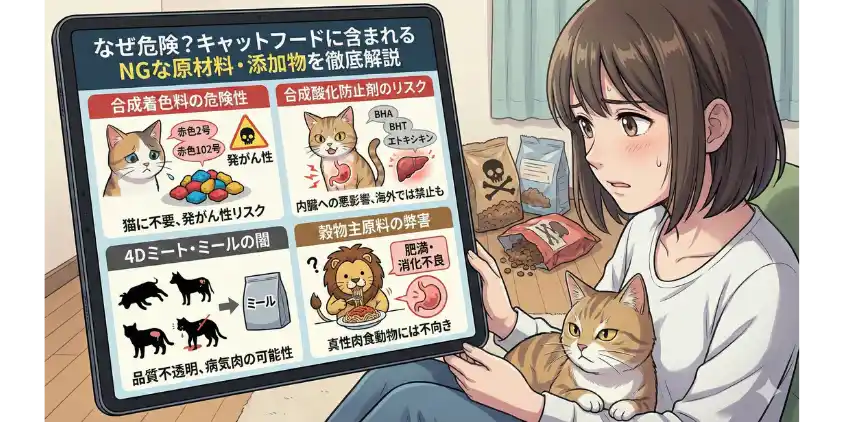 実名リストに挙げた商品には、猫の健康を脅かす可能性のある原材料や添加物が含まれています。ここからは「なぜ危険なのか」を、一つひとつ根拠とともに解説します。