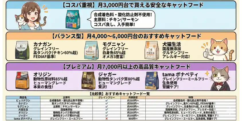 「じゃあ結局、何を選べばいいの?」という声にお応えして、予算別に安全なキャットフードをご紹介します。すべて合成着色料・合成酸化防止剤不使用で、主原料が動物性タンパク質の商品です。