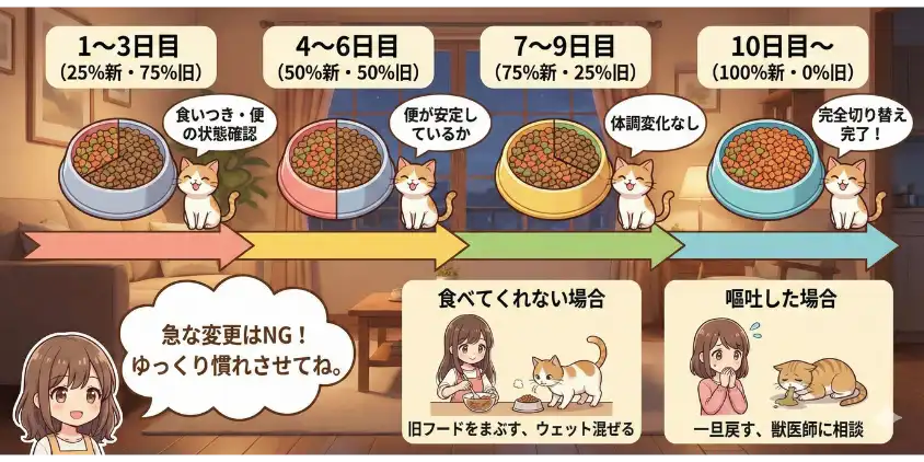 キャットフードの切り替え方法|失敗しない7〜10日間ステップ